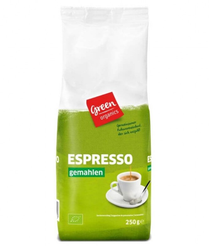 Green Organics Café Expreso Molido. Sabor intenso y aroma rico, ideal para preparar cafés expressos o bebidas a base de café. Producto 100% ecológico, procedente de cultivo sostenible.